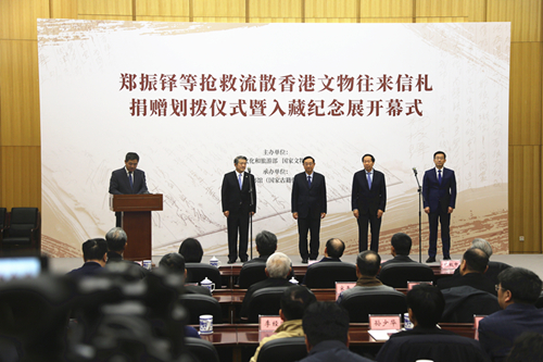 12月26日,文化和旅游部、国家文物局在中国国家图书馆隆重举行“郑振铎等抢救流散香港文物往来信札捐赠划拨仪式暨入藏纪念展开幕式”。文化和旅游部部长雒树刚向捐赠方中国嘉德国际拍卖有限公司颁发捐赠证书,并宣布展览开幕。国家文物局局长刘玉珠发表讲话,中国嘉德国际拍卖有限公司创始人陈东升、中国国家图书馆馆长饶权分别致辞。国家文物局副局长关强主持仪式。